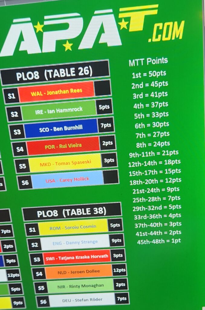 Мики Фидановски ги победи своите противници на NLH и освои нови 12 бода за Македонија. Нашиот тим е со реални шанси за голем успех. Во моментов лидер на табелата е Германија кои имаат 89 поена ,додека нашата селекција во моментов има 30 бода помалку, но во 19:00h ќе се игра главниот МТТ турнир во кој ќе учествуваат 48 натпреварувачи од 12 држави, а победникот ќе освои 50 бода за својата држава, второ пласираниот 45, третиот 41, 4ти 37….итн.