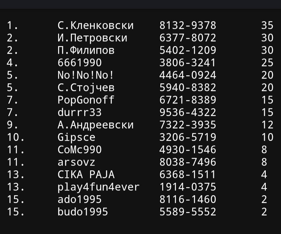 Вака изгледа моменталната табелата после две одиграни рунди ,а во недела е наредниот рангиран турнир со гарантиран тикет за главниот настан во Аполонија Гевгелија идниот месец. Регистрациите се отворени за сите !